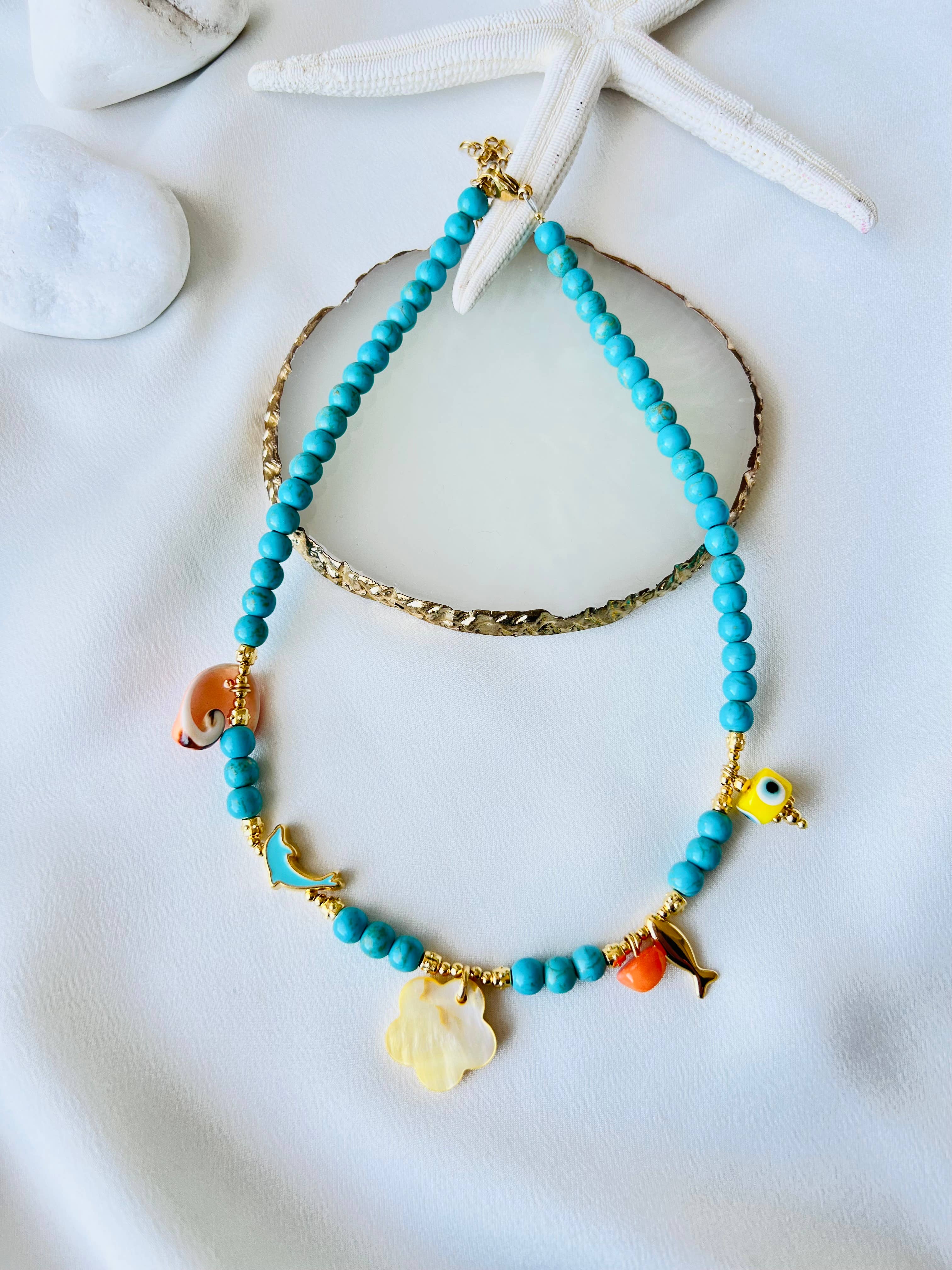 Howlite beads Filntisi Glass Goldplated copper parts with 24k gold Shell 36cm long plus steel adjustment